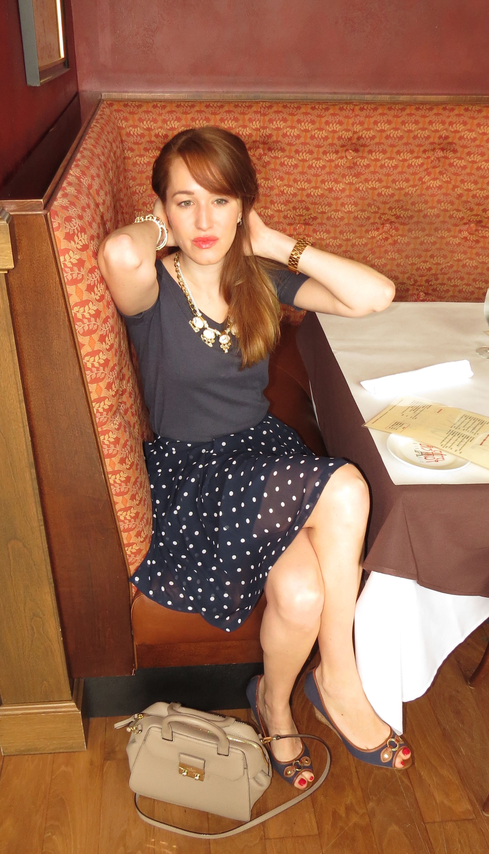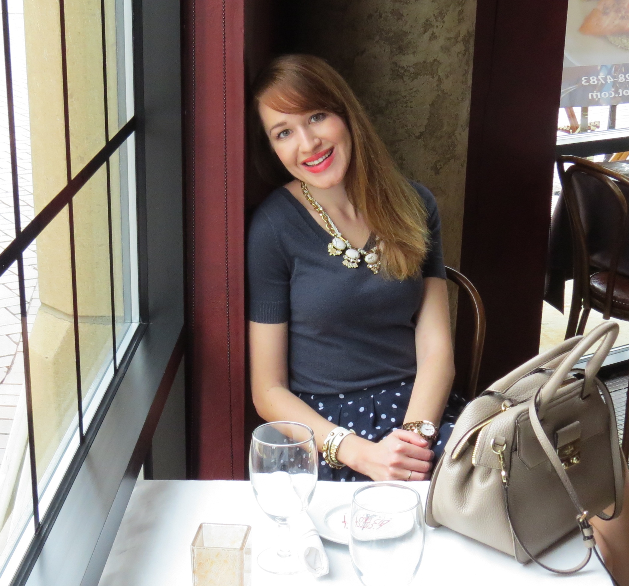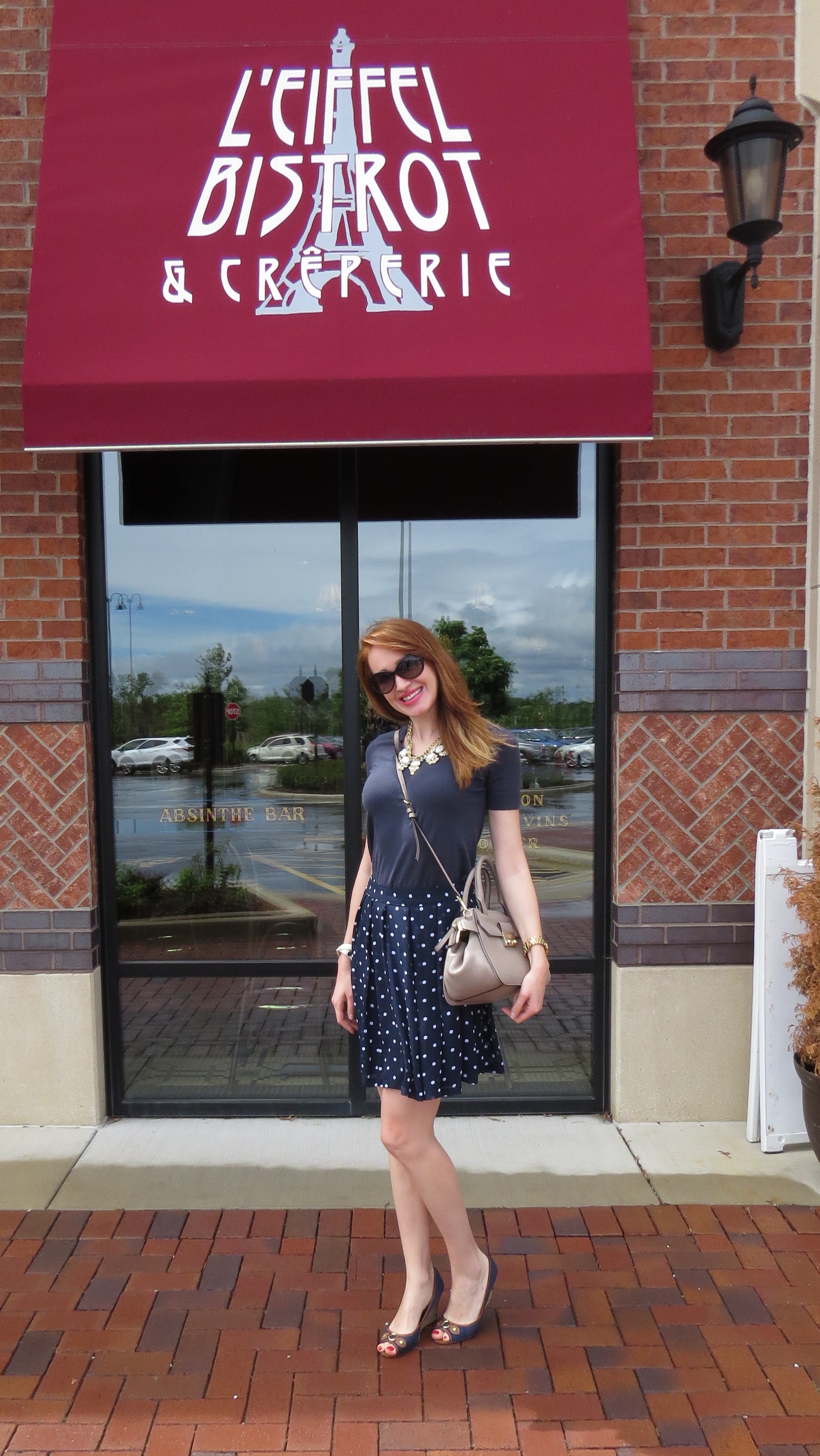 When I see that weekend weather is windy and cold I immediately want to crawl under my blanket and sleep all day. This Sunday, however, I decided to go to my favorite breakfast place instead. This place called L’Eiffel Bistrot and Creperie has the most delicious crepes and coffee. It’s as cozy as can get with french influenced art work, great music, and authentic french cuisine. Every time I eat there it sets the mood for the entire day. My Sunday outfit was a very simple combination of navy, beige, and polka dots.