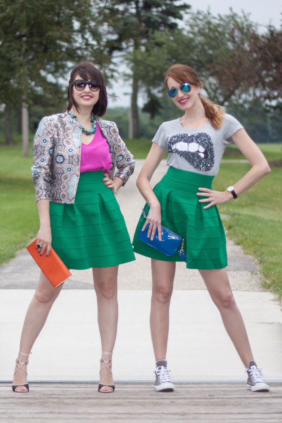 An idea of writing a double-look post featuring the same article of clothing worn two ways came about approximately the same time we decided to start this blog. But it never quite materialized into anything until Elena and I went shopping and saw green skirt at H&M that both of us fell in love with. The vibrancy of the color and a fun playful style seemed like a winning combination neither one of us could resist.