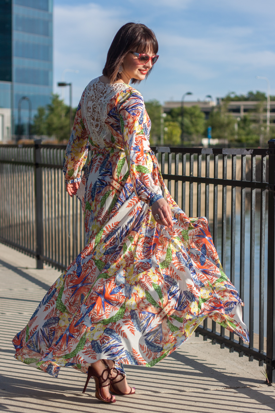 Floral maxi dresses are demanding things! They require a proper occasion, just the right kind of accessories and, most of all, they require movement. And guess what happens when you don’t satisfy the requirements – you end up with a granny dress instead of a hot trendy number you were hoping for. So what’s the secret? Take these floral creatures outside, they make rather ostentatious impression, and appear out of place at indoor events. Leave them at home early in the morning or late at night as they will look too dressy before noon or too frivolous at formal gatherings. Late afternoon is really their golden hour, that’s when your dress will shine in its most romantic light.