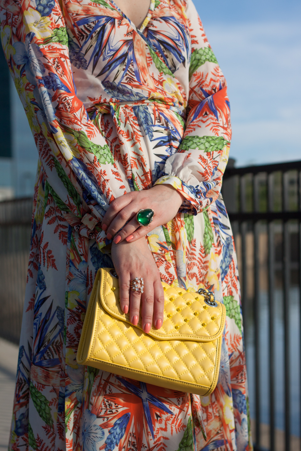 When picking accessories, don’t try to overpower the pattern by introducing additional colors or complex textures. The dress won’t leave a chance to the competition and will destroy the whole look. Instead, stick to the colors of the dress itself, play off of its natural beauty and try to enhance it. Note how my shoes, bag, sunglasses and even ring all have a complementary color on the dress.