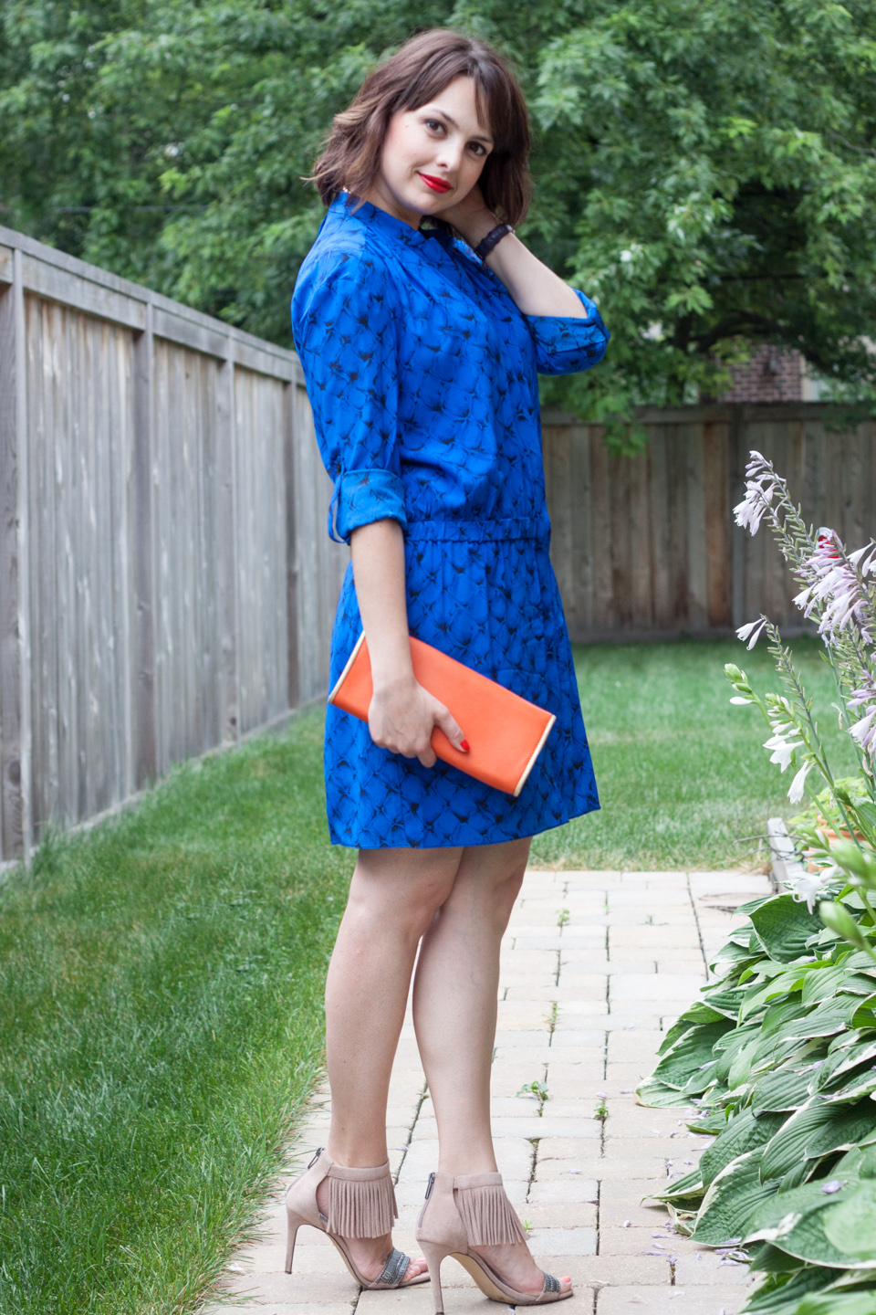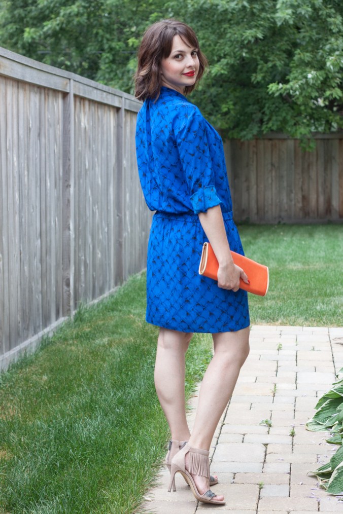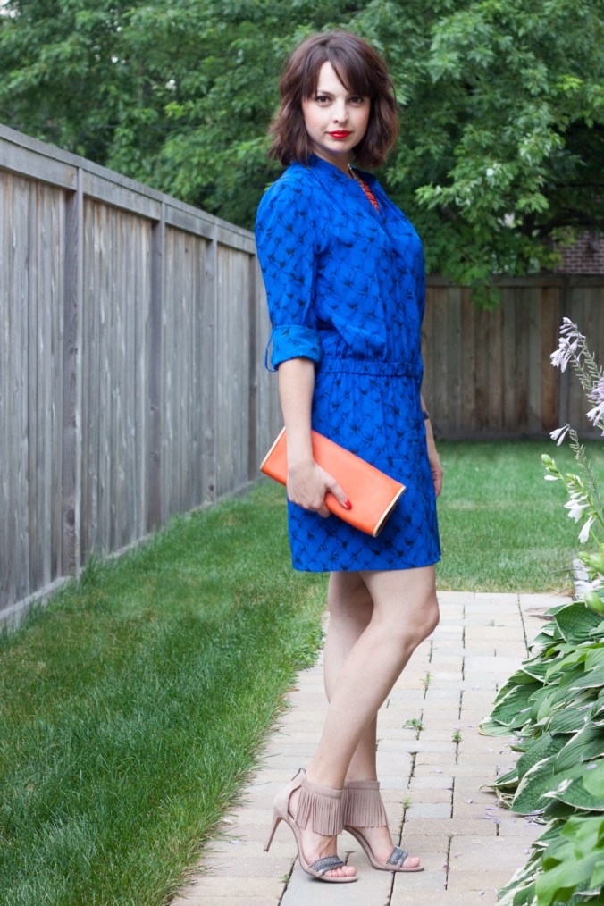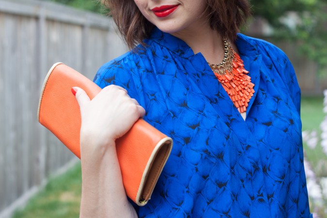 Blue and orange has been my recent favorite as far as color combinations go. I simply couldn’t find a blue piece bold enough to take on the orange pairing until this electric blue dress winked at me from one of the clearance racks. The fact that the dress was on sale, made of 100% silk and from a great designer has all been an added bonus, of course! But what sold me on it was definitely the color.