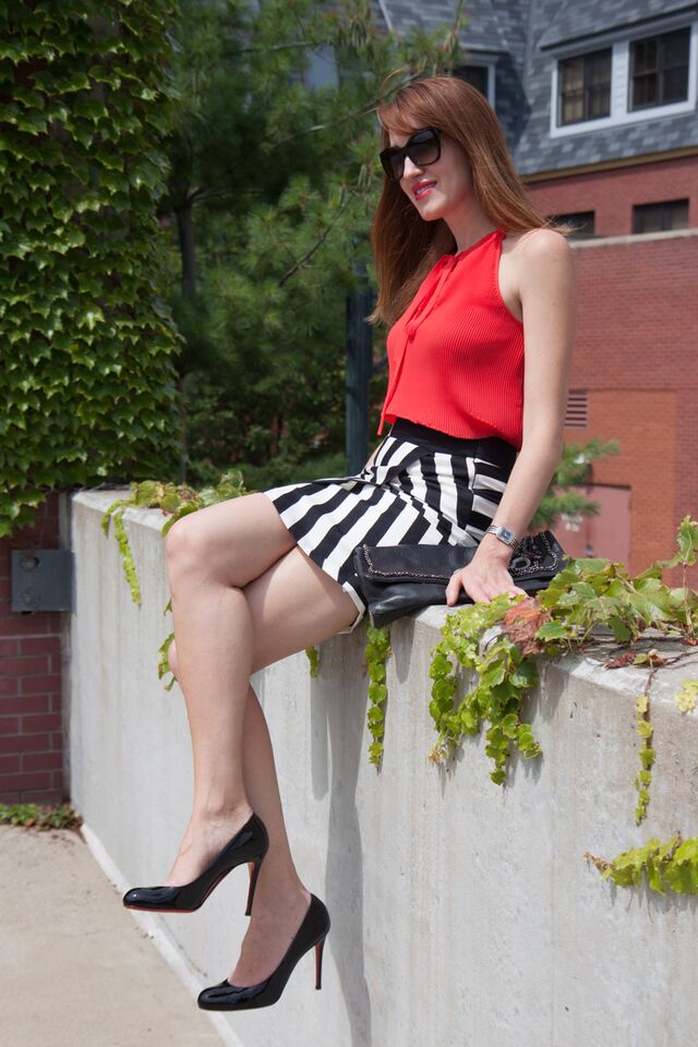 As you might have noticed I like minimalism in my clothes with occasional pops of color. In todays look I combined black & white striped sarong skirt, black pumps, and bright red halter neck pleated top. My accessories are very subtle and neutral, I’m letting the blouse get all the attention. I like how red brought life to this look and made it day to night wear. Wear it with natural makeup for a day, darker vampy color lipstick for a night, hair in the top knot for a bit of Parisian chic. Options are really unlimited. What I’m trying to say you girls need a red top in your wardrobe!