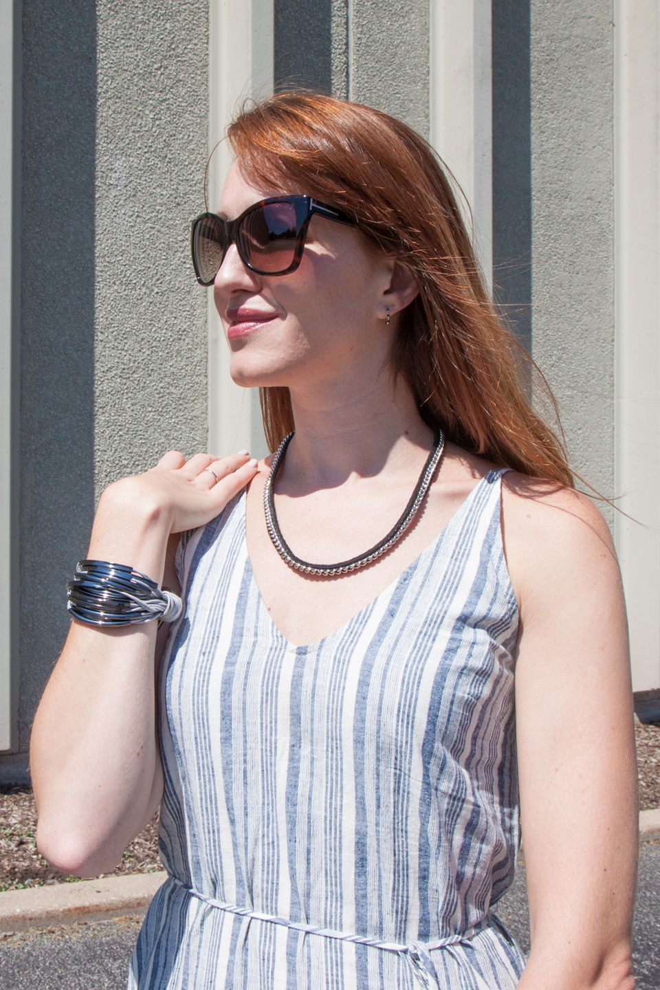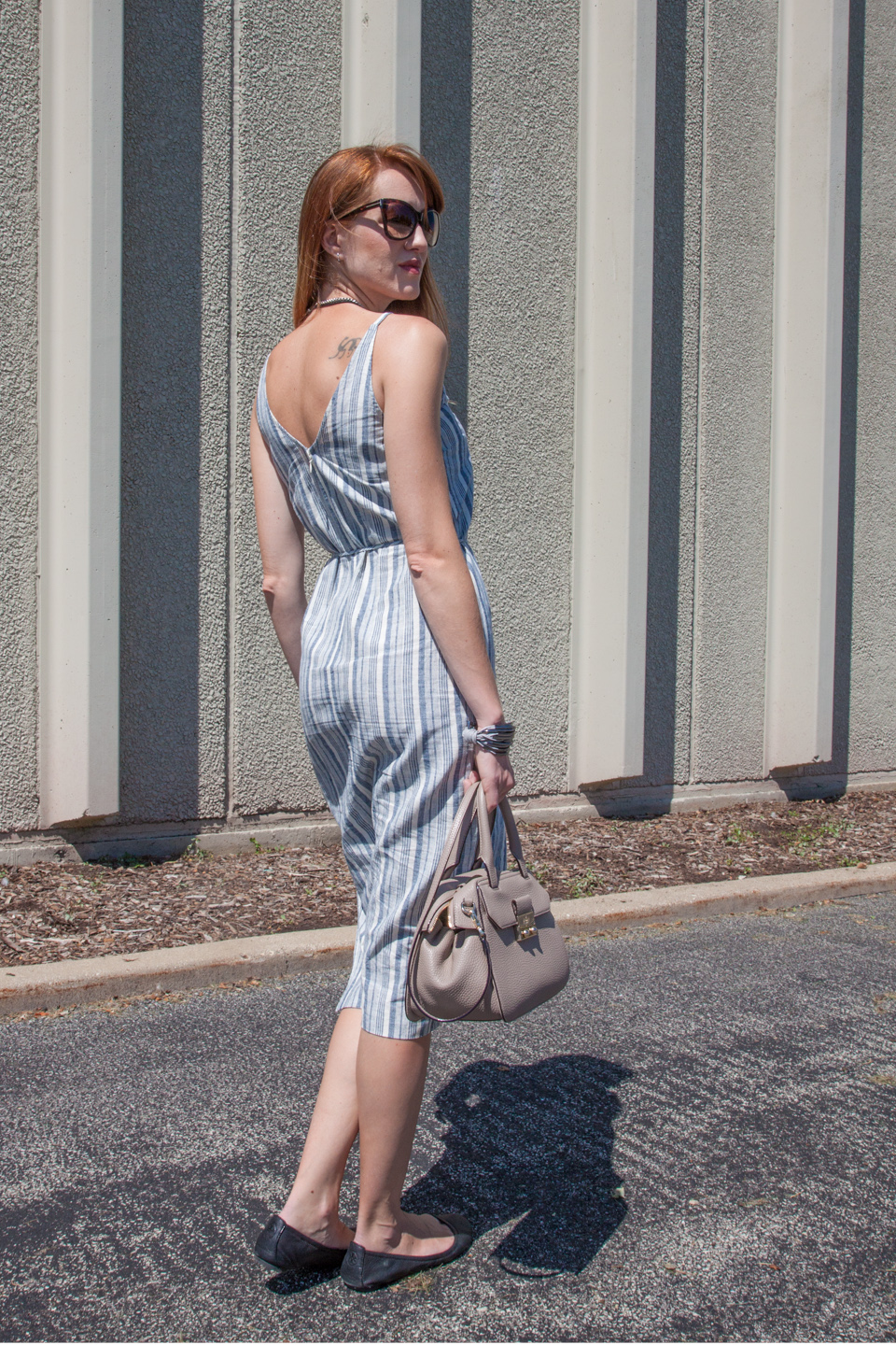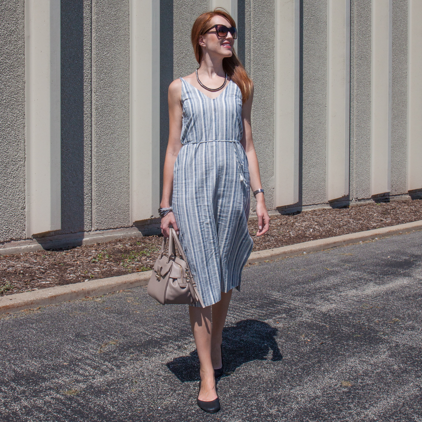 Today’s look is as simple as it gets: linen midi dress in cream and chambray stripes, white blazer, and flats. Summary linen cotton is so summary and breathable, I’m having hard time not wearing this dress all the time.