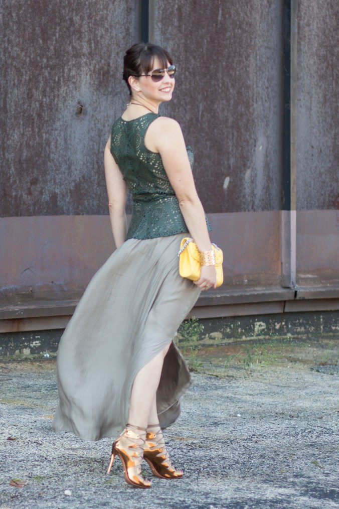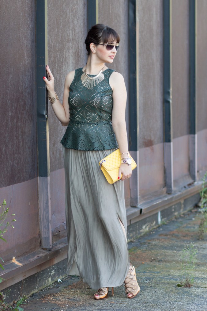 Long grey flowy skirt and gold accessories certainly add the “glam” element to the look. And green faux leather cut-out top serves as an edgier link to the rustic environment.