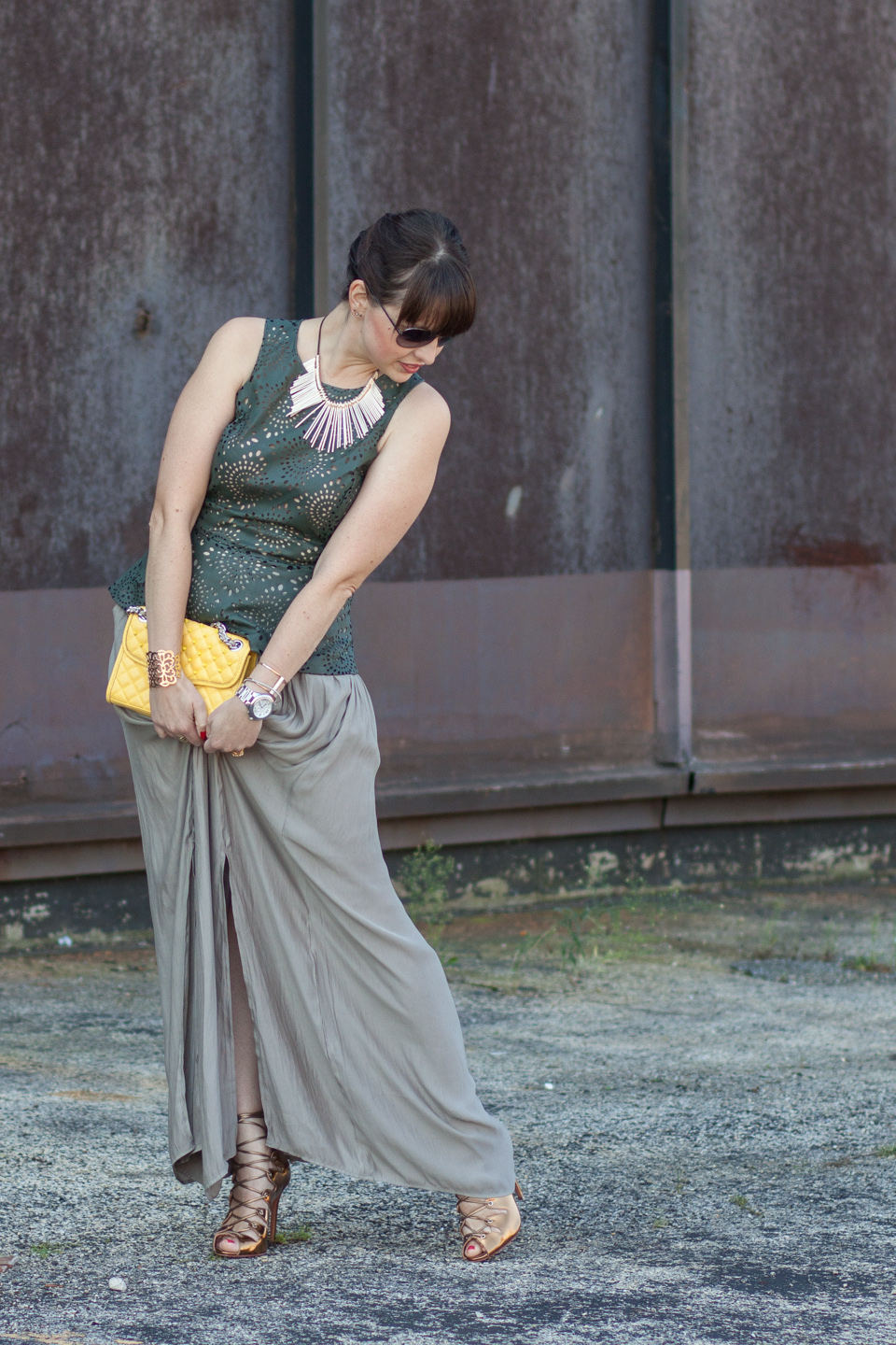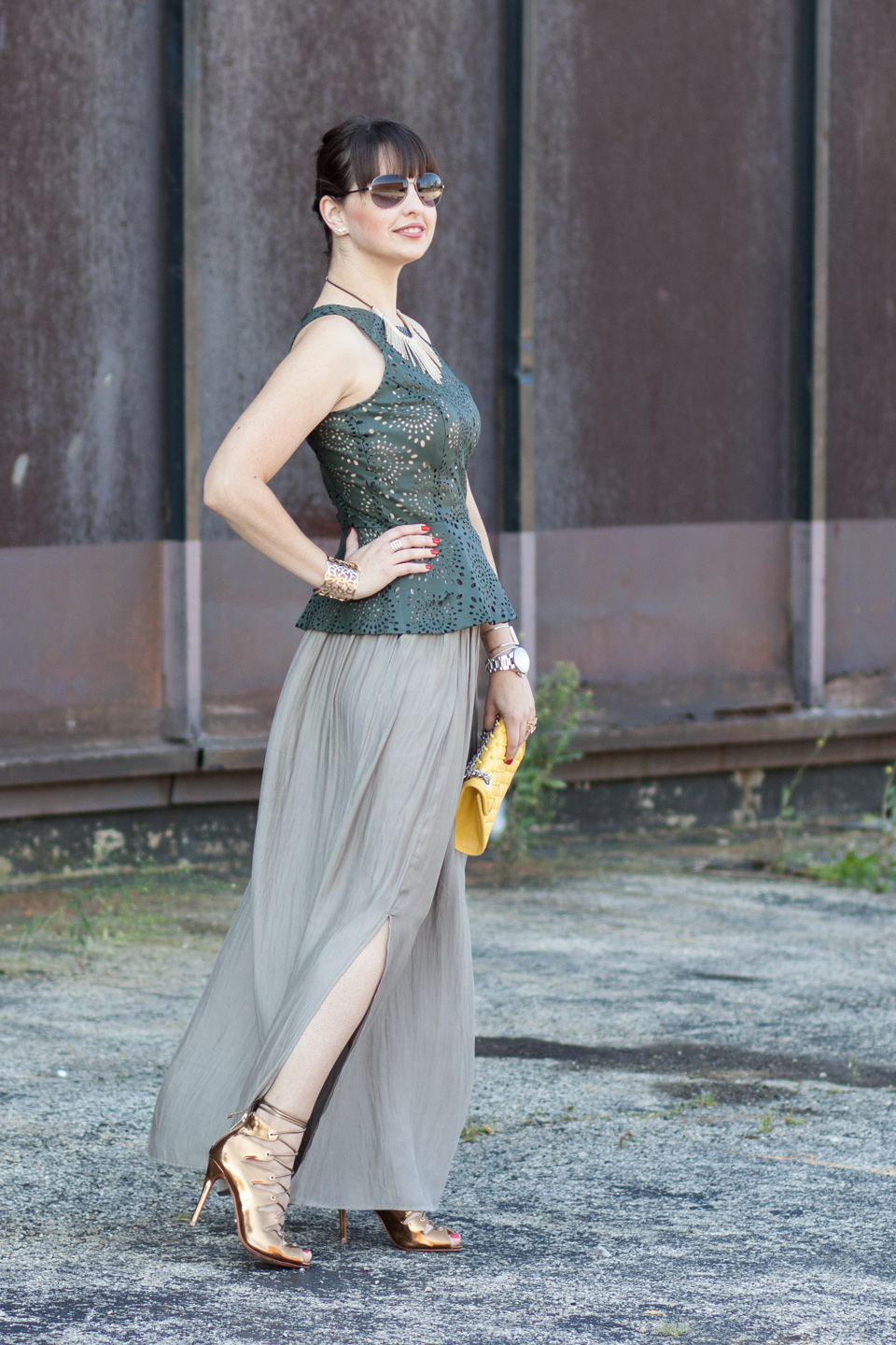 Long grey flowy skirt and gold accessories certainly add the “glam” element to the look. And green faux leather cut-out top serves as an edgier link to the rustic environment.