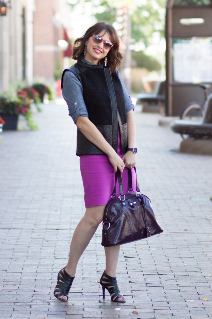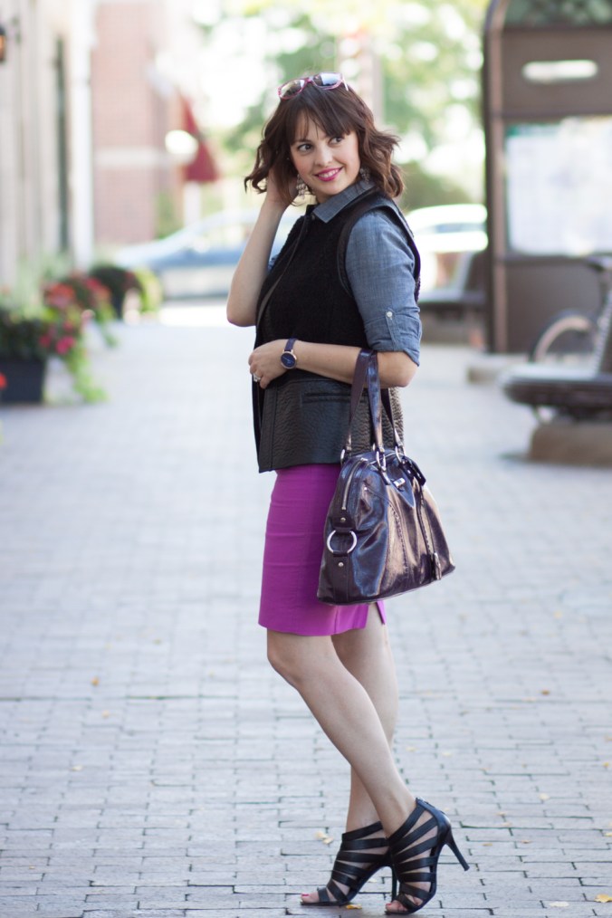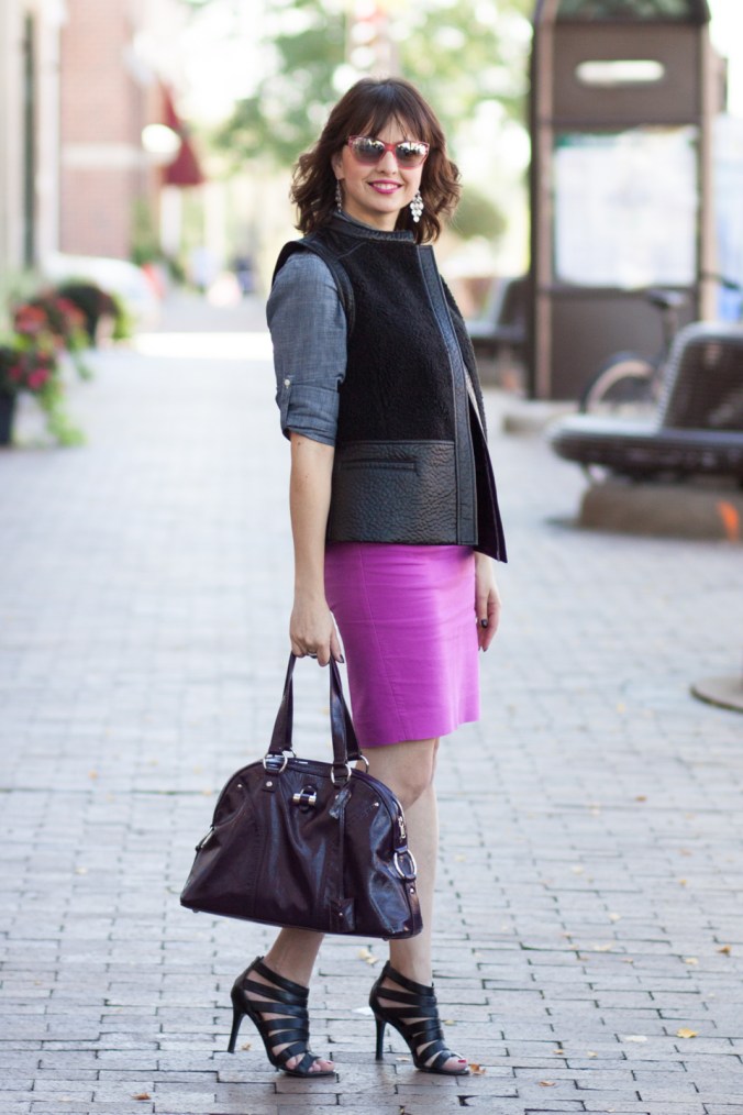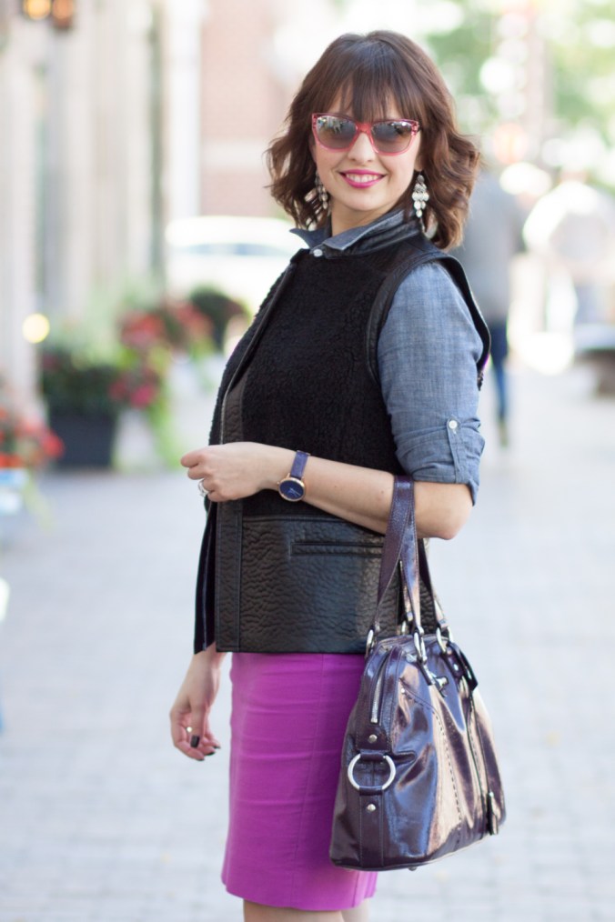 Well, this turned out unexpectedly Parisian…  But regardless of the elaborate location choices, the look is quite simple. I, however, received a bunch of compliments on this outfit despite it’s simplicity. The secret recipe is always the same – bright colors and texture! What turns heads in this case is the brightness of the fuchsia skirt and the faux leather/fur texture of the vest. Everything else in the outfit just supports the “key players”.
