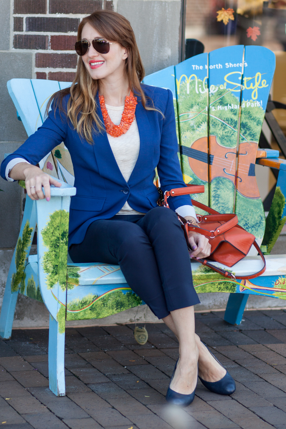 What you wear to the office has to be dress code appropriate but no one said it should be boring. As much as I love simplicity, mixing in bright color elements is an easy way to make the outfit pop. This time my new orange necklace by PAOLA FRANI set the tone for this look. What can be happier than bright orange statement piece? Offset by blue jacket, blue skinny ankle pants, and burned orange Calvin Klein Tote this necklace is an attention getter.