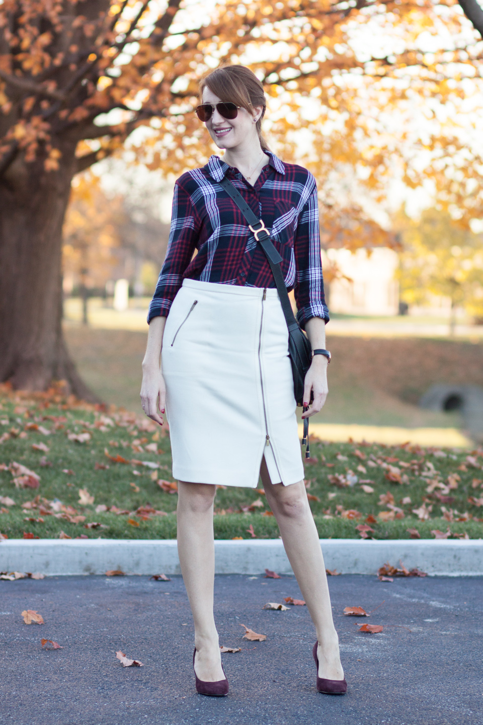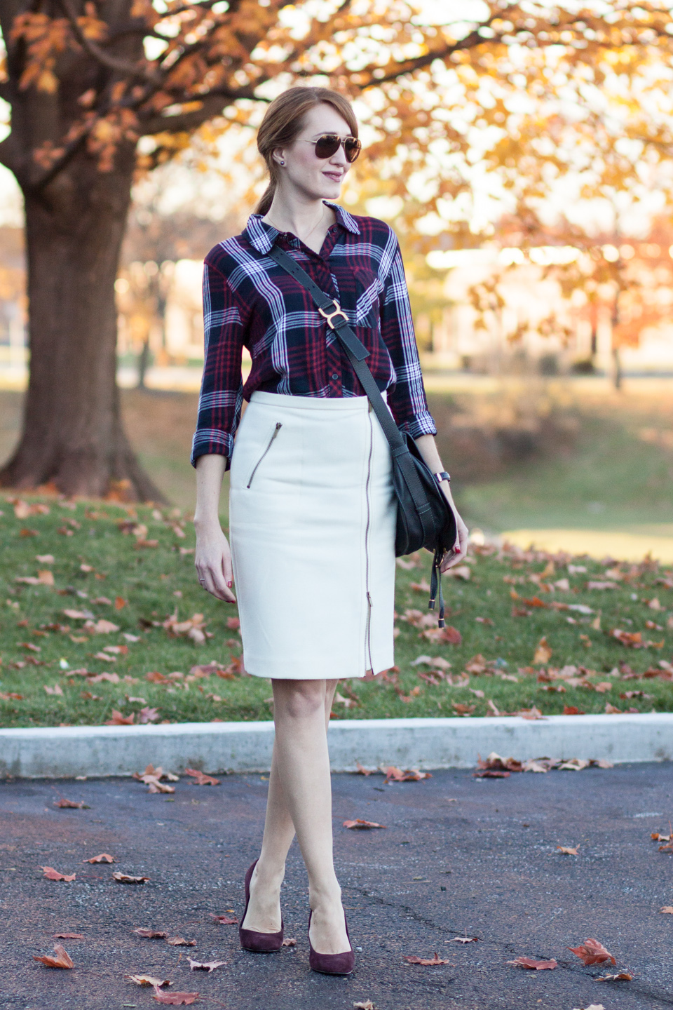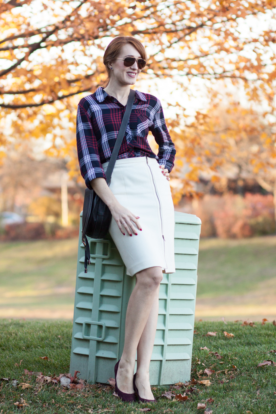 I’ve been obsessed with an assortment of plaid patterns this season. The shirt I’m wearing here is by Rails,  a brand that’s an absolute master of quintessential plaid shirts. The softness of the fabric is divine and it is as comfortable as can be.  The mix of relaxed plaid and structured wool of the pencil skirt is a perfect combination of comfort and chic.