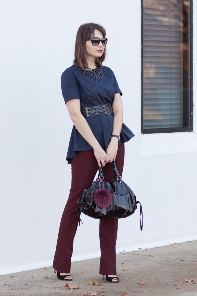 Love this – the colors are perfect together, the accessories are just right (that pom pom matches exactly!) and that peplum top is so cute! You look great!