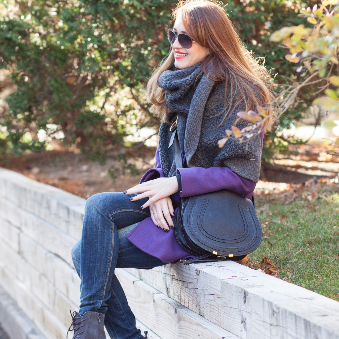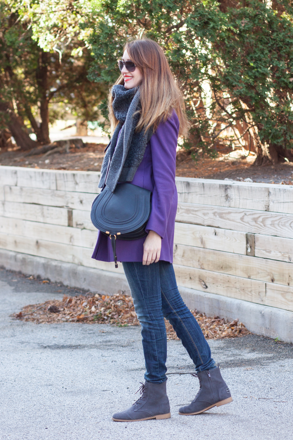 Most people prefer simple, classic, neutral color coats. Classic outwear makes getting dressed on a chilly day easier. Being more of a neutral-colors girl myself, I still crave a bit of color on occasion. Wearing a bright statement coat breaks the greyness of a fall day quite nicely. This purple coat below by United Colors of Benetton is one of my old favorites. It comes in 4 different colors and allows you to either stay in your color comfort zone or be adventurous. Stay warm and colorful!