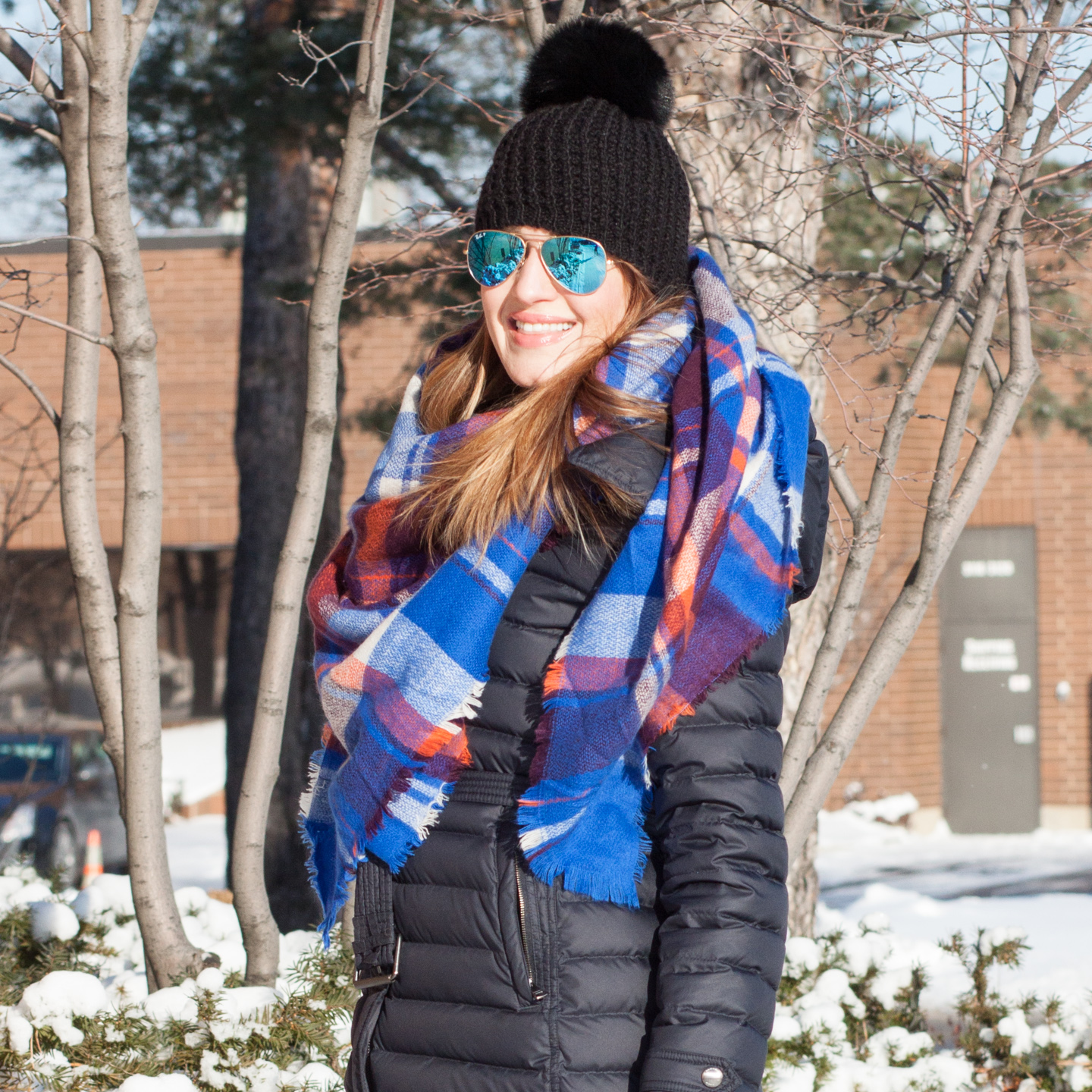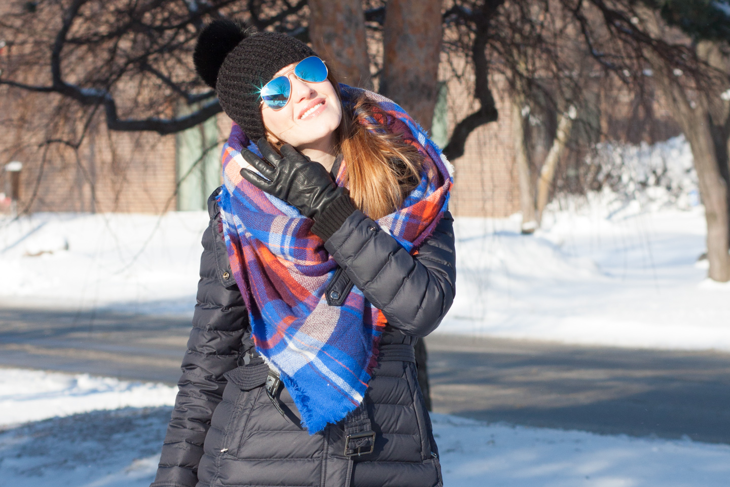 The one I’m wearing is navy blue but there are lots of great options in the stores right now – grey, olive, blue, burgundy, and, of course, light colors like white and beige. Another thing I would recommend looking for when choosing your jacket is quilted silhouette and a belt. It will add some shape even to the puffiest jacket and voila – perfect hourglass body! And of course when getting ready to go outside in the cold, don’t forget a blanket scarf, hat, and gloves. Your choice of accessories is truly limitless. Stay warm!
