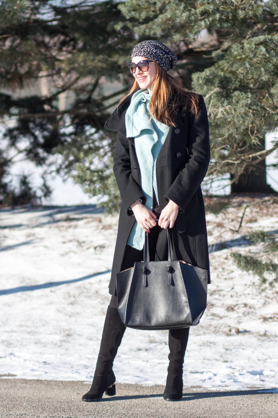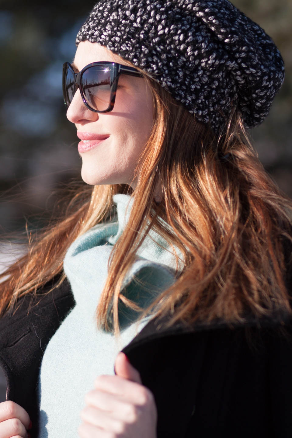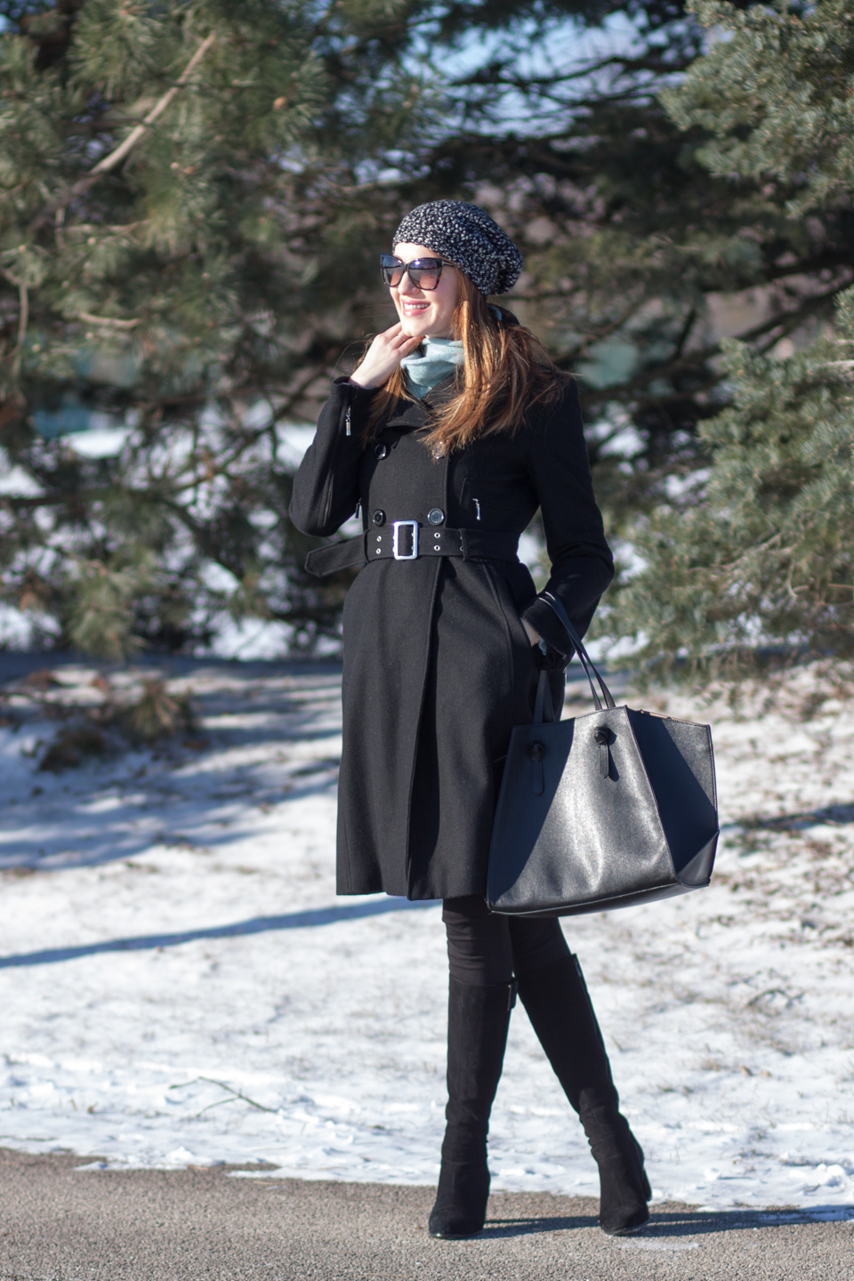 The day we took these pictures must have been the coldest day of the season. The air was very crisp and sun was shining. It wasn’t the easiest thing to take pictures in the cold but we still decided to go for it. The cardigan sweater I’m wearing is truly one of the warmest sweaters I have in my wardrobe. And what’s better than wearing an icy blue sweater on the chilly day? 🙂 The rest of the outfit is very much a monochrome black. I promise I’ll make my outfits brighter and lighter as the warmer days come, but for now, darker and richer shades are what I’m craving. Enjoy!