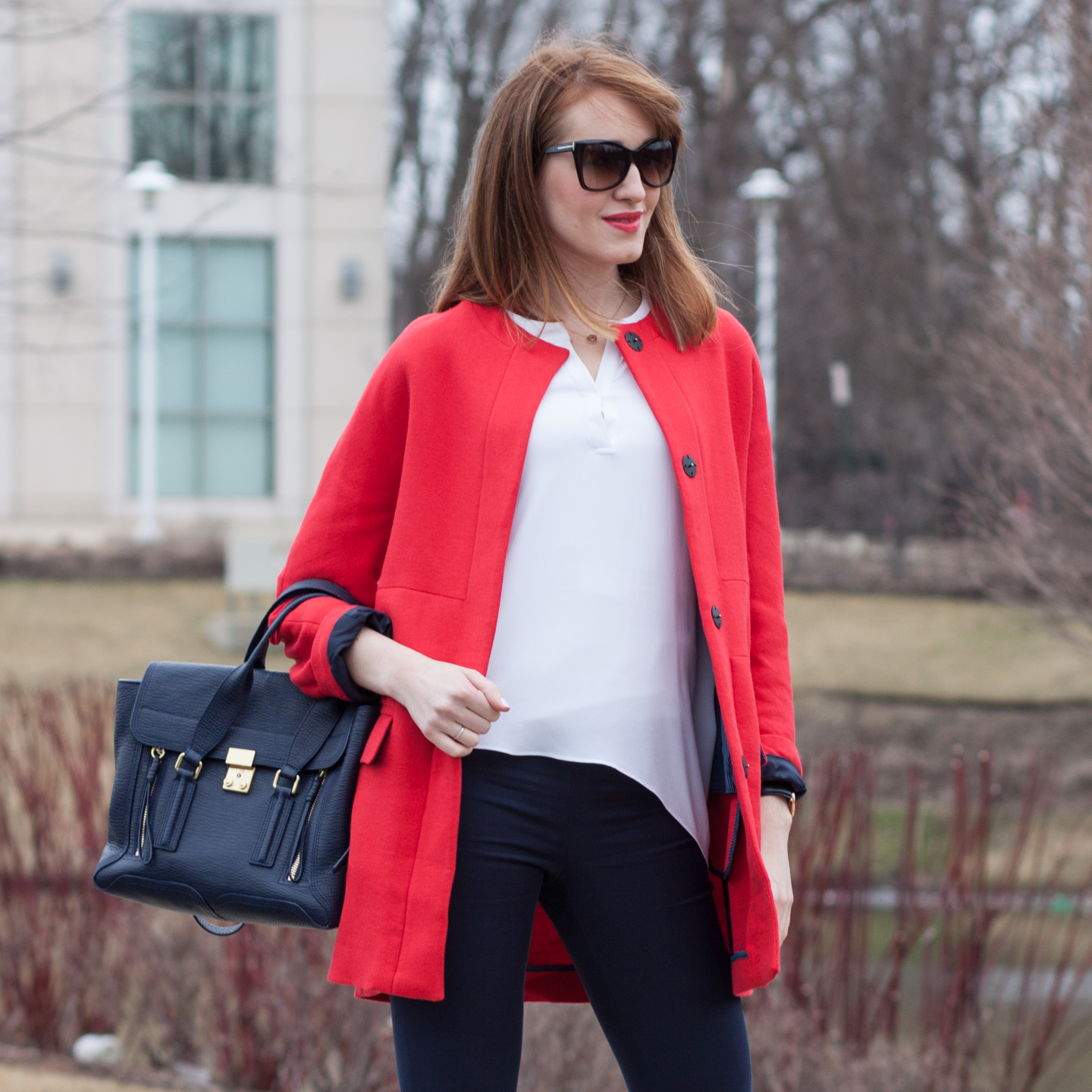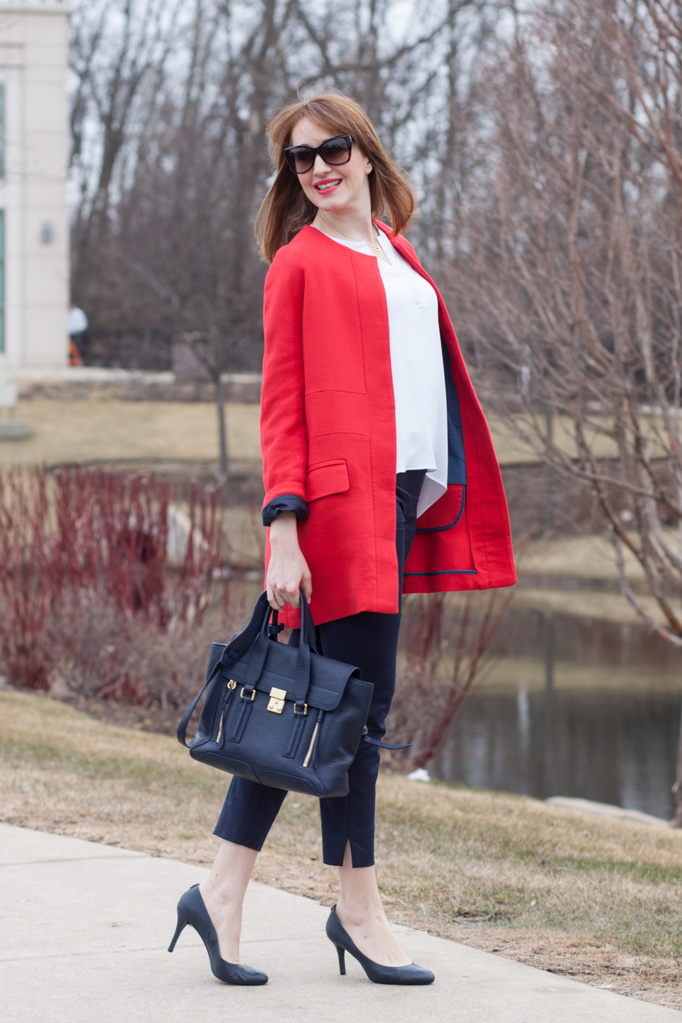 The coat I’m wearing was purchased about 2 weeks ago and it has sold out almost immediately. However, they have very similar coats in different colors and textures. See below in “What I’m wearing section” for links. I paired the coat with navy blue pants, bag, and shoes to compliment the bright red shade. White blouse was a great neutral element that added freshness to the look. As always, my outfits are office friendly but I can easily see myself wearing it after office hours.