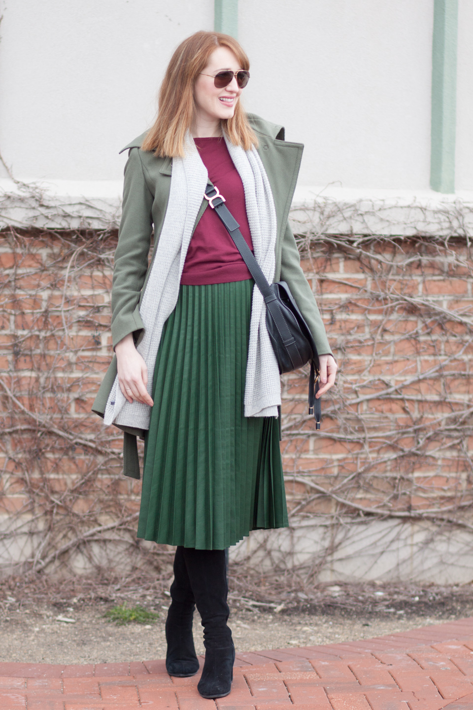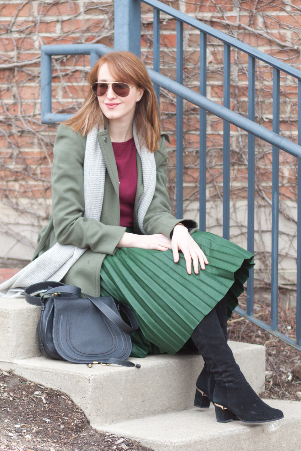 What I’m wearing: Benetton coat, similar here and here; Zara skirt; Topshop top; Vince scarf; Chloe purse, more budget friendly here; my old boots but similar styles here and here.