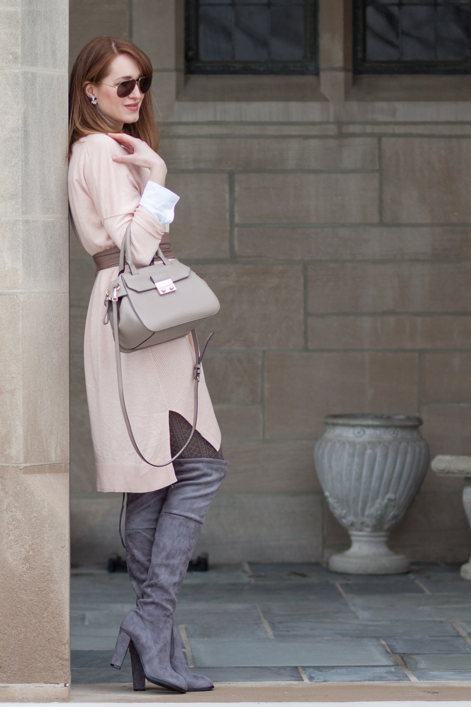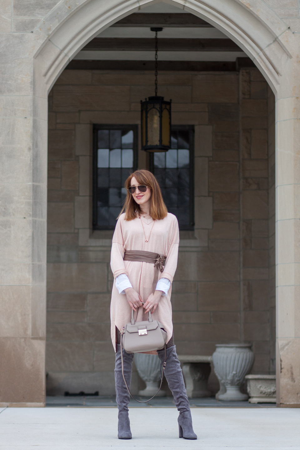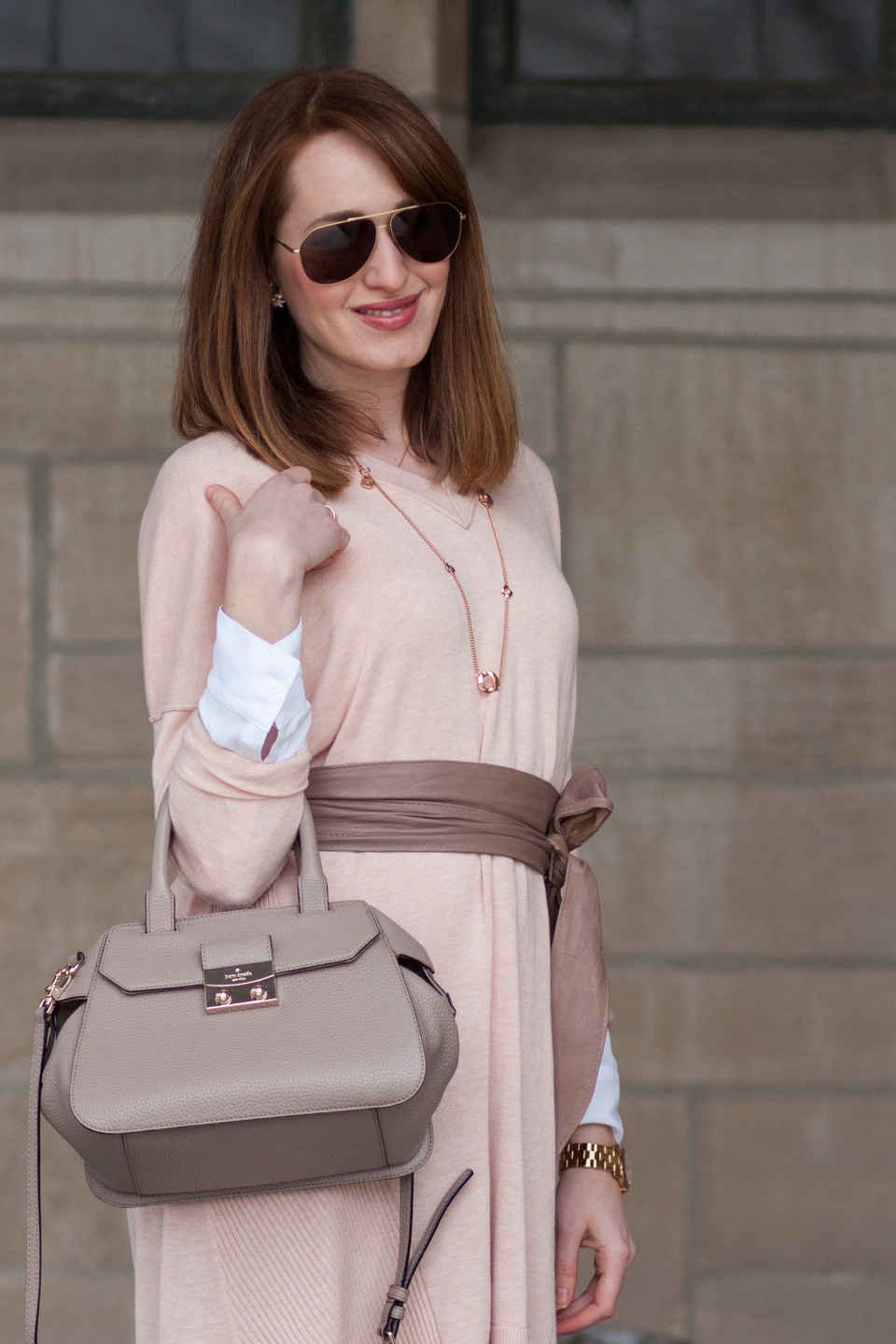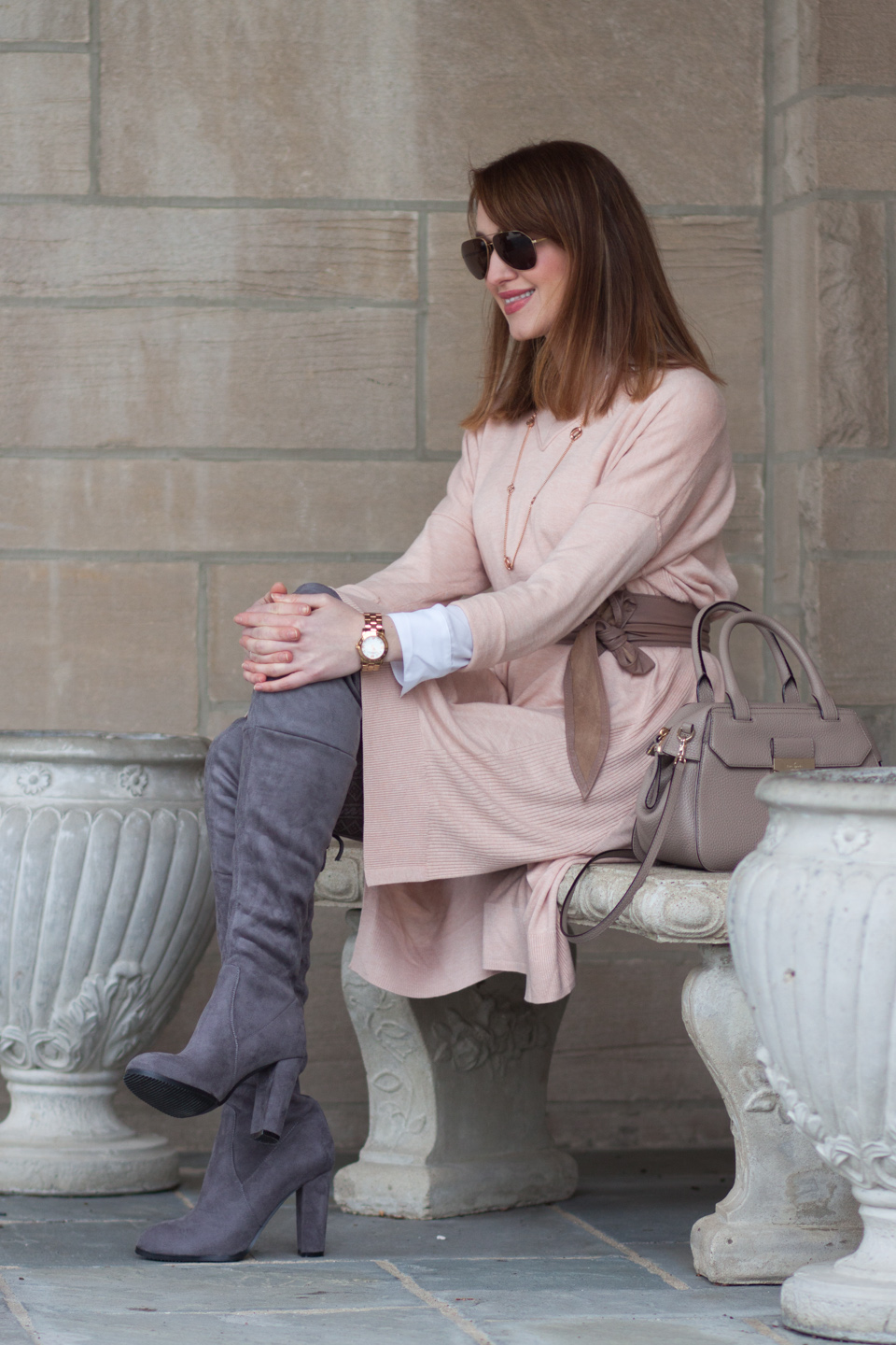 Today’s look is inspired by pantone color of the year, Rose Quartz, and one of my favorite bloggers Galant Girl.  I was very excited to find this new dress because of its color and versatility. It looks great when worn loose but I decided to add a bit more shape to it and added a belt. The dress works for winter, spring, fall, or even a cooler summer day. And it wouldn’t be me if I didn’t incorporate something grey in my outfit.