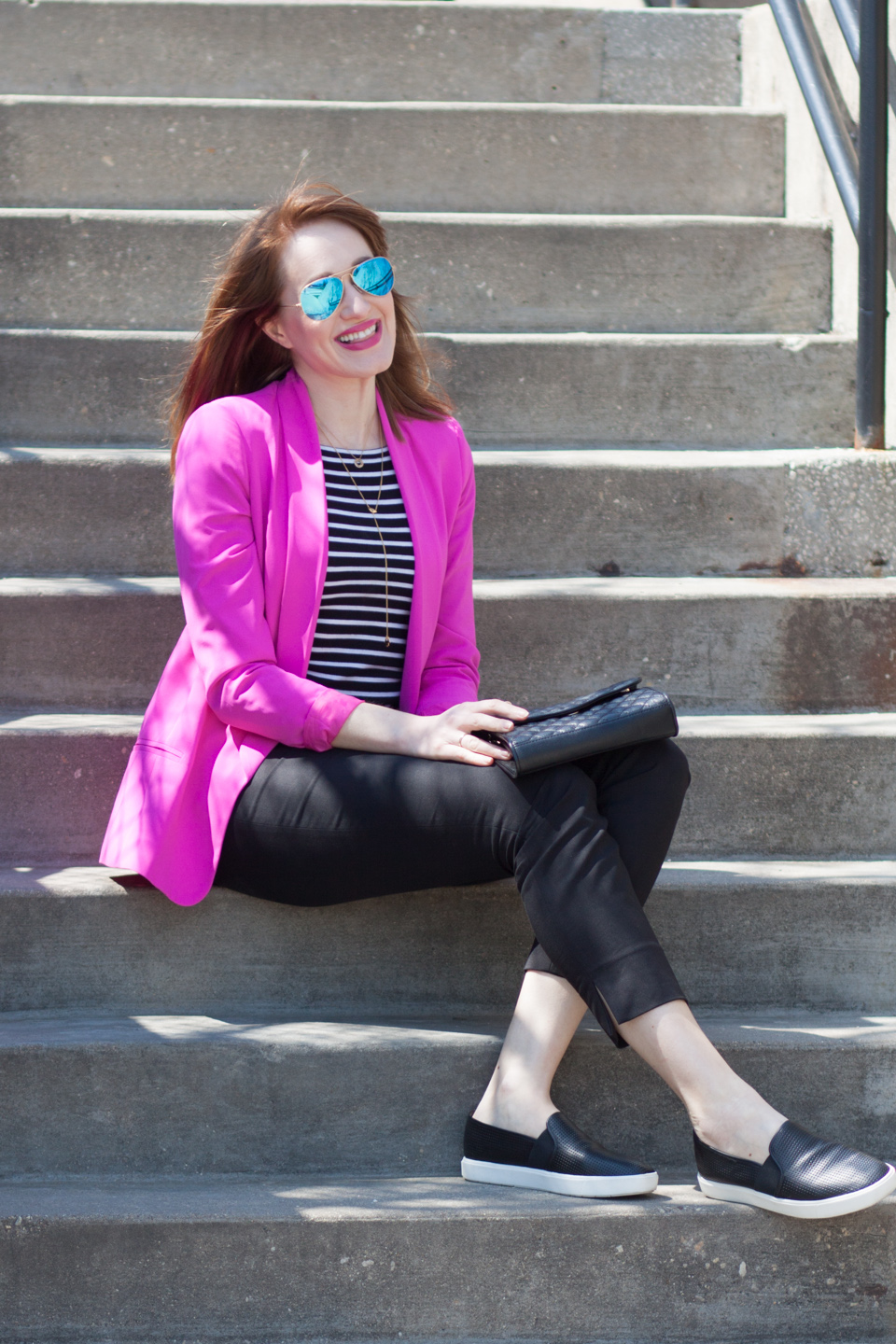 A sunny spring day and a bright pink blazer that makes you stand out from the crowd – what can be better? Well, my new Vince sneakers are amazingly comfortable and adorable. I can’t stop wearing them since I got them :). Definitely a must have this season!