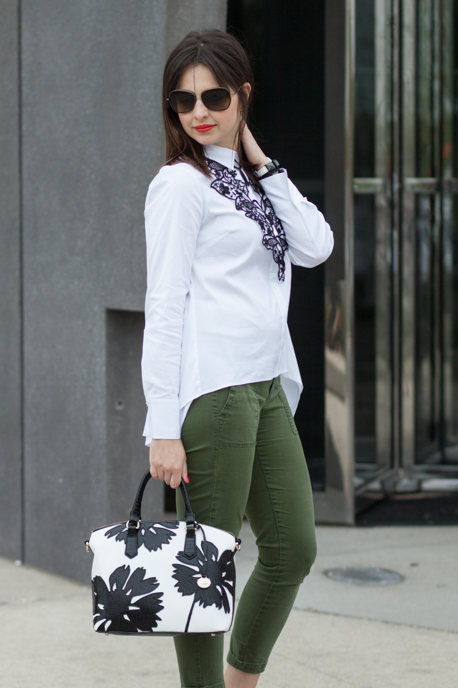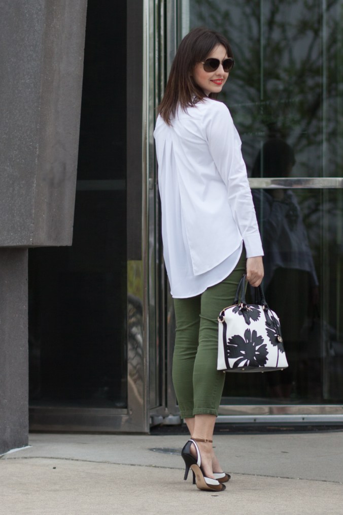 || white split-back poplin shirt || green skinny pants || colorblock pumps – similar here and here || B&W Brahmin satchel || black lace necklace ||