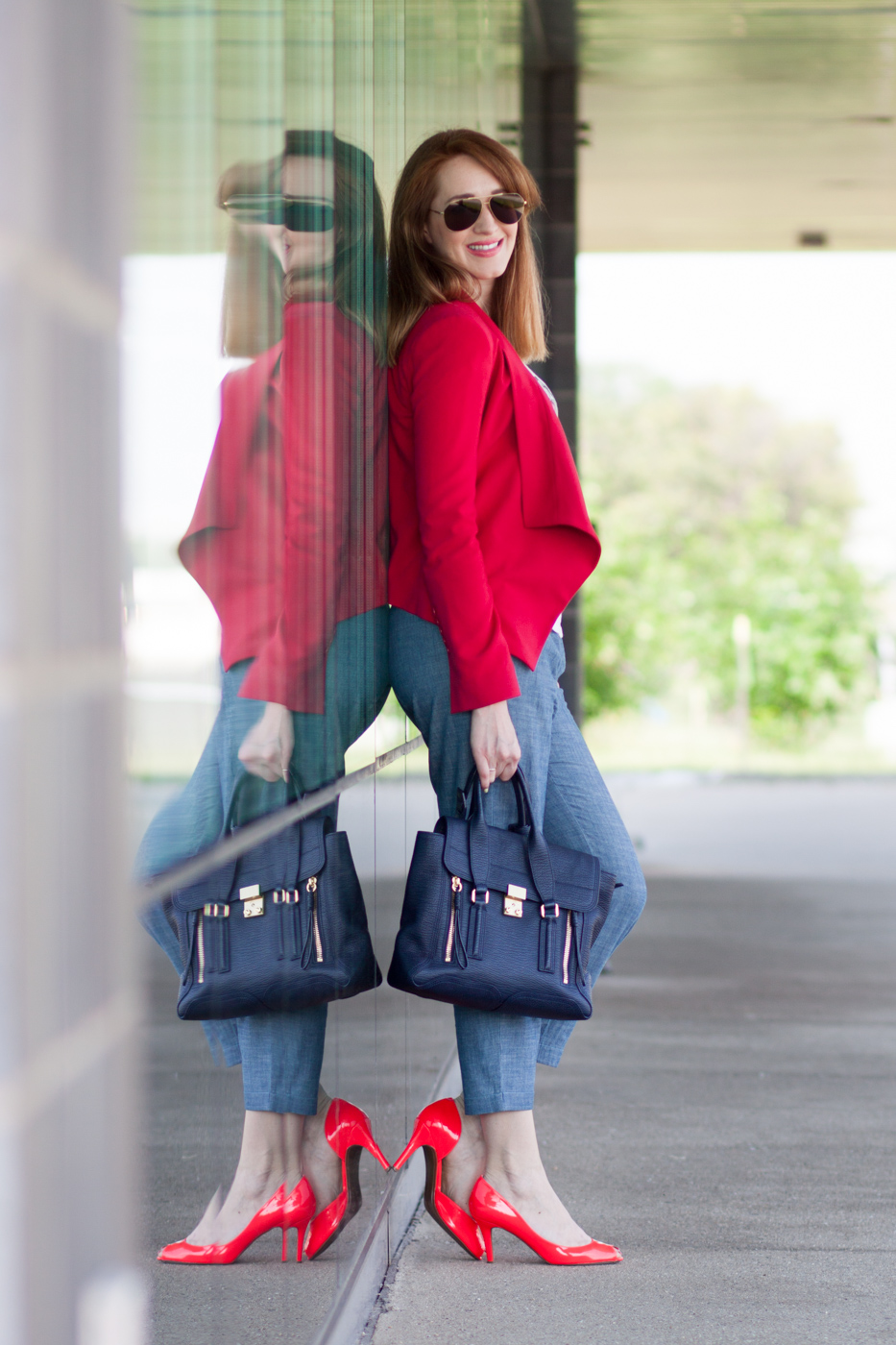 This post is about what I wore for my casual Friday. I work for a big corporation and, unfortunately, can’t wear jeans to work. However, no one said anything about chambray pants….. So here I am in my semi-jeans, t-shirt, and a red jacket.