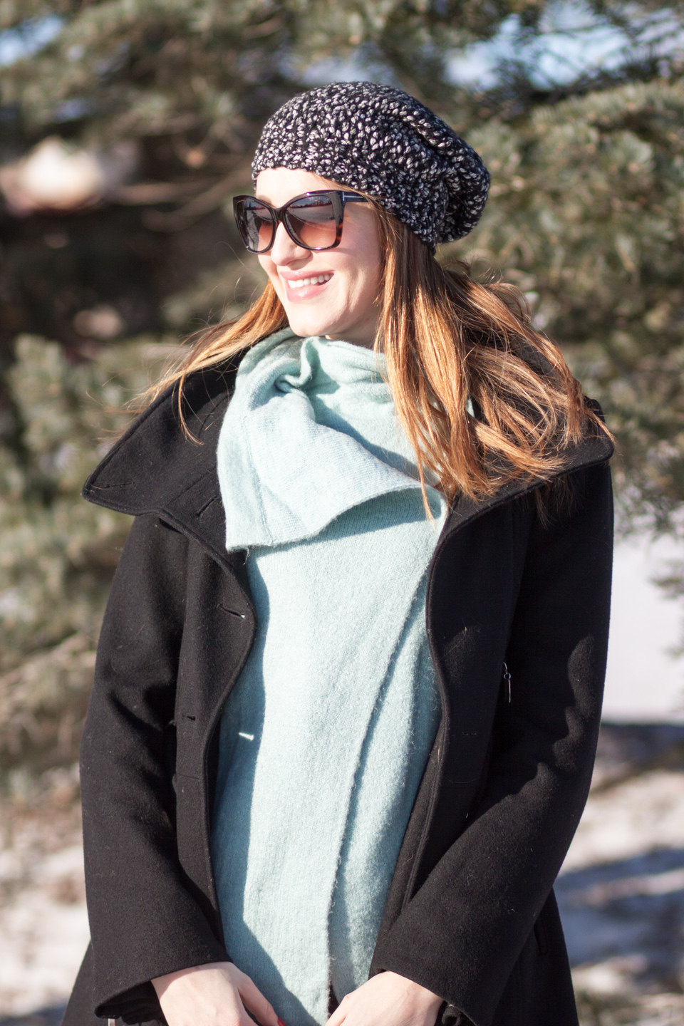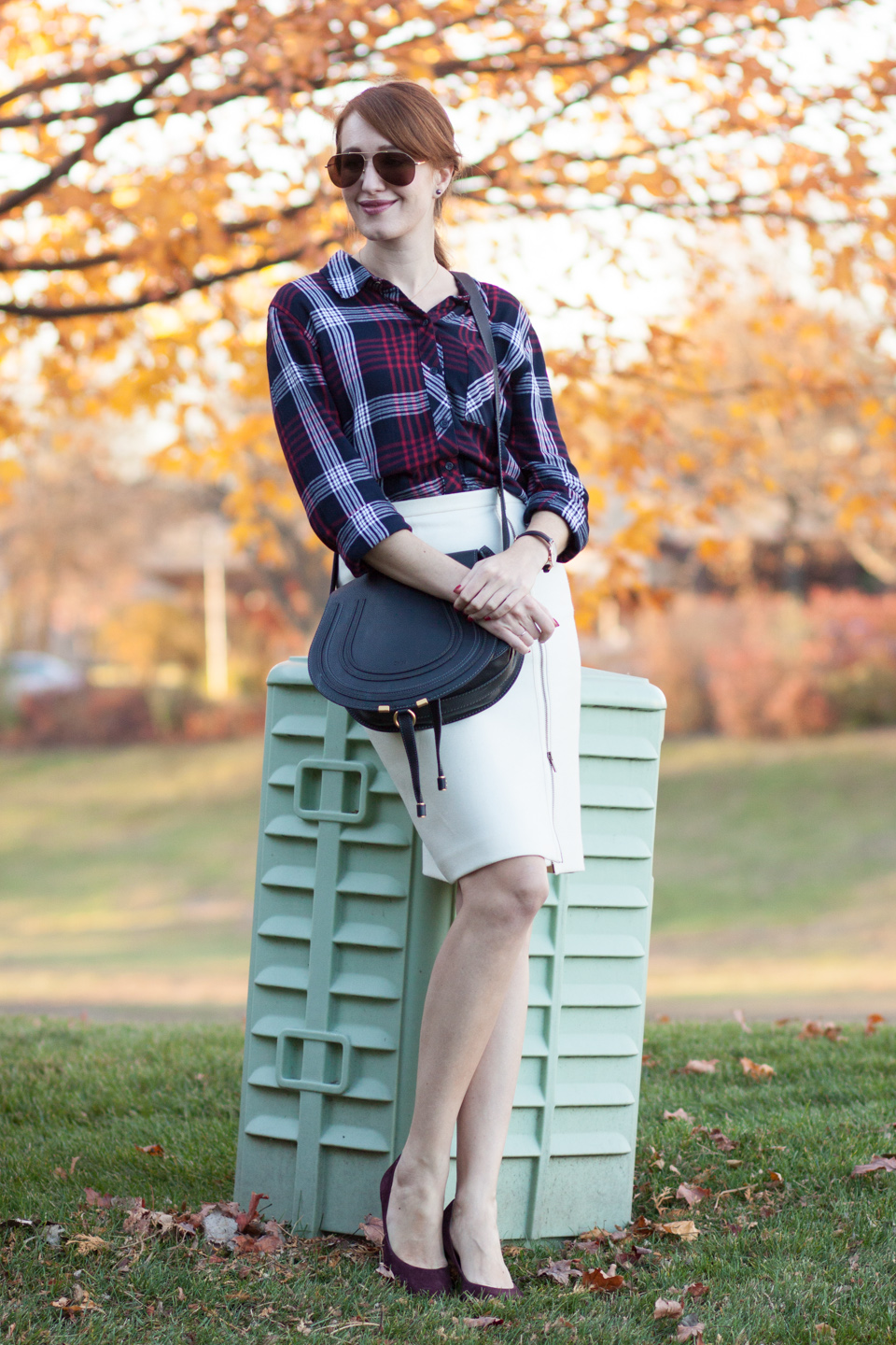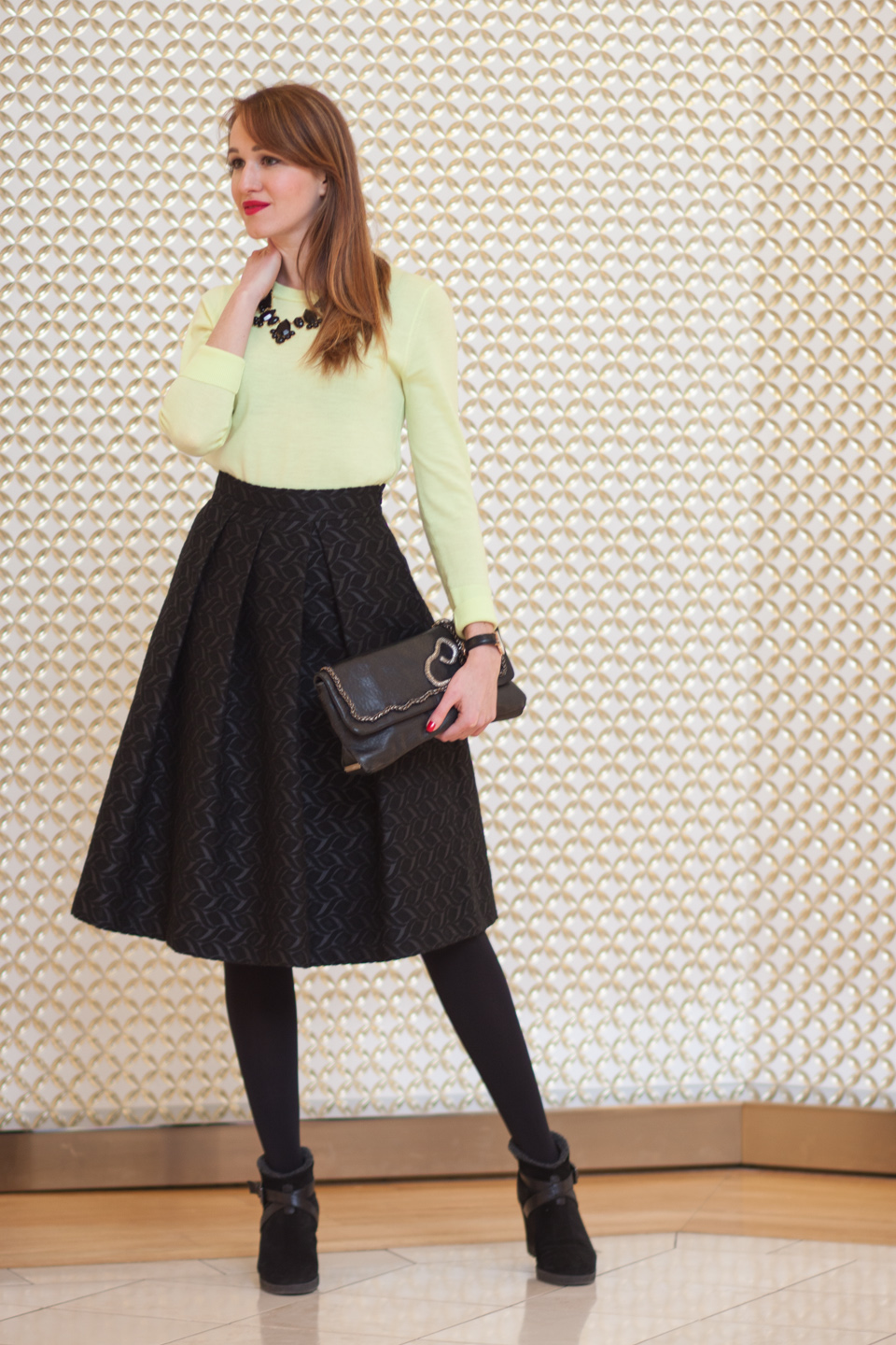 I’m wearing my textured full midi skirt with a neon yellow sweater, black necklace, short booties, and a clutch. It’s been one of my favorite looks this winter and early spring. But as it gets warmer outside I can’t wait to pair it with a bright top and a pair of pumps.
